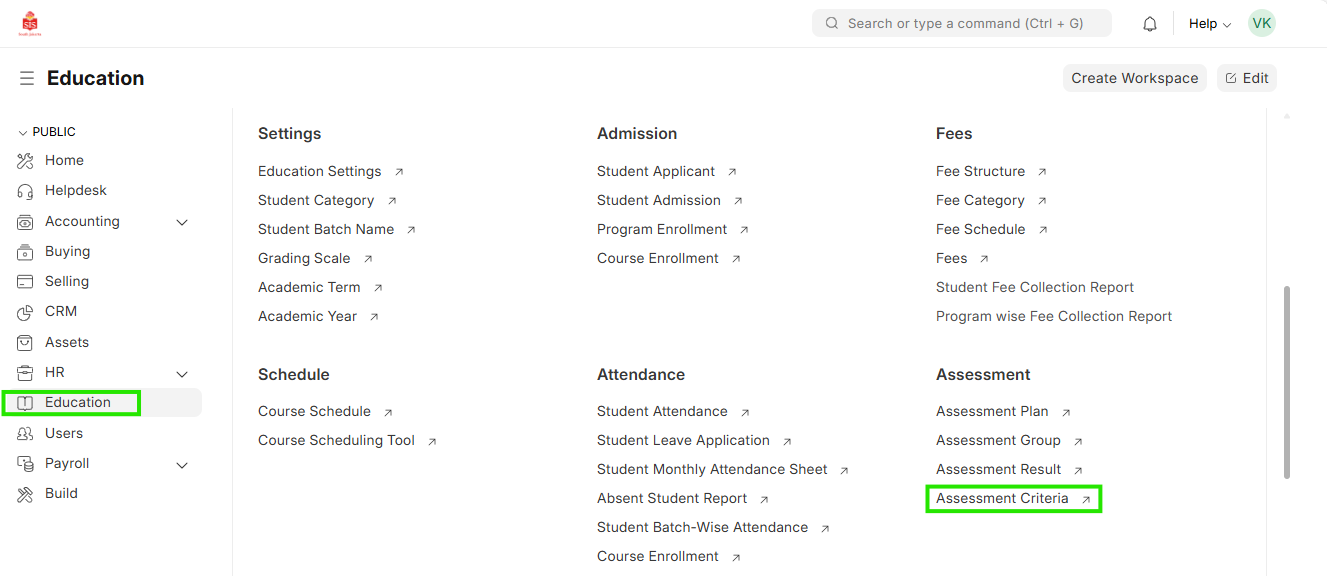 - Select Education module and select Assessment Criteria