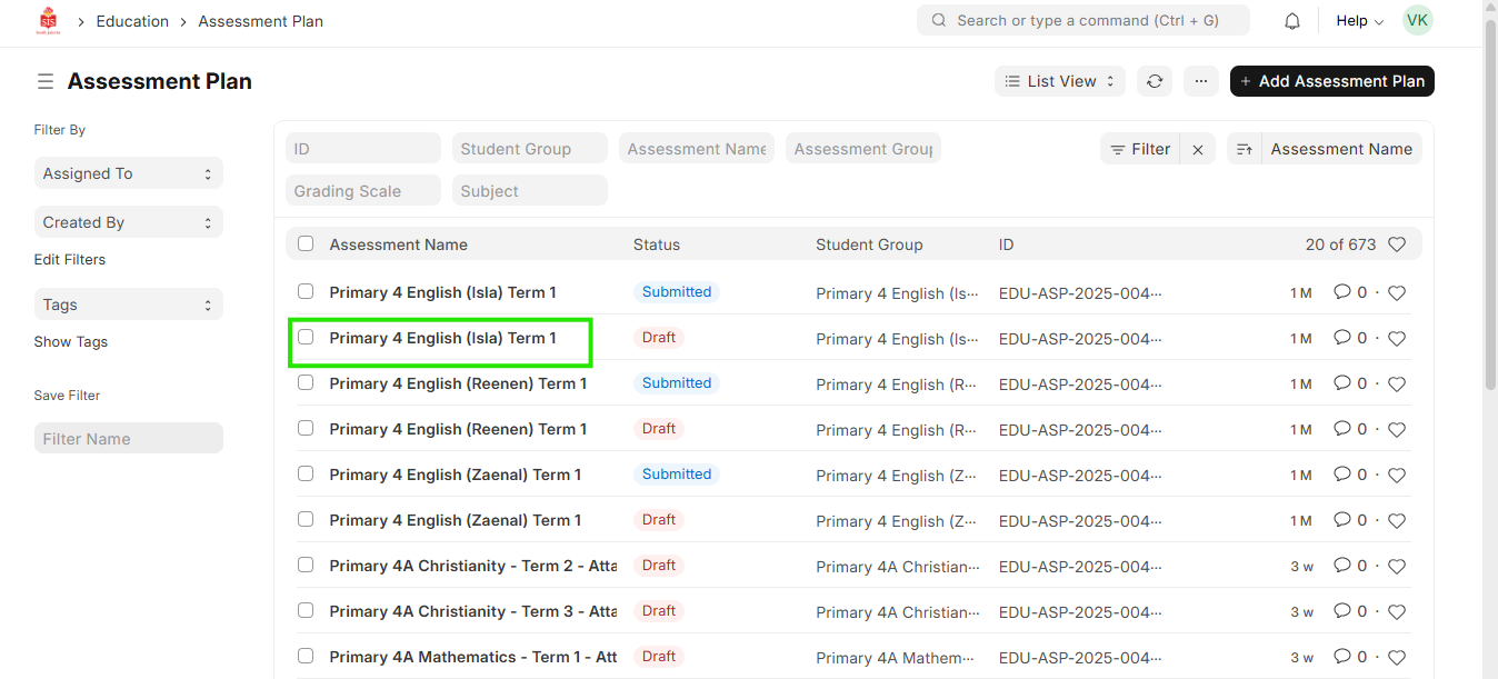 2. Filter and check the name of the assessment plan that needs to be changed. Click and open the assessment plan