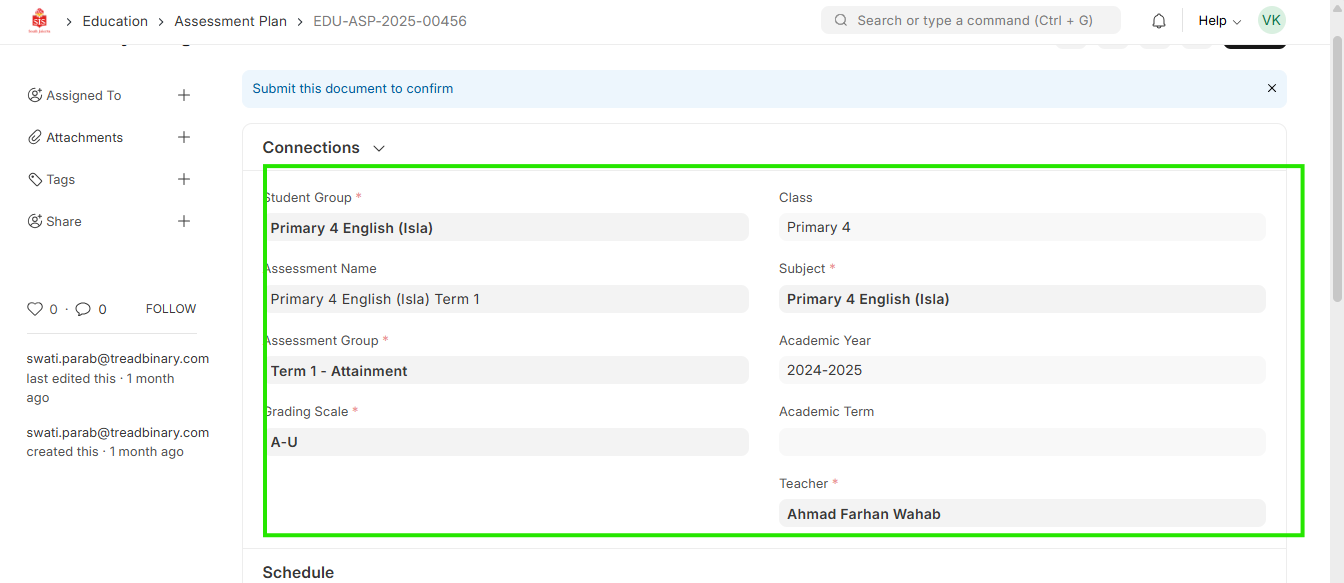 - In the connections tab, check if there are any assessment related documents created through the plan
