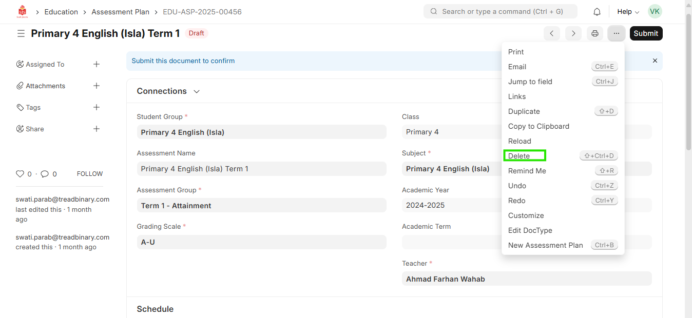 4. If there are any assessment results linked to the assessment plan, they will need to be cancelled within the Assessment Result doctype