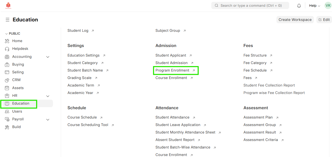 - Select Education module and click on Program Enrollment
