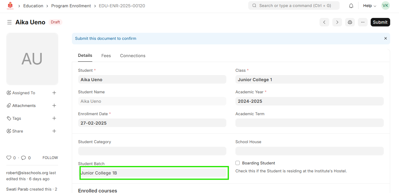 2. Search and select the student for whom the batch needs to be updated