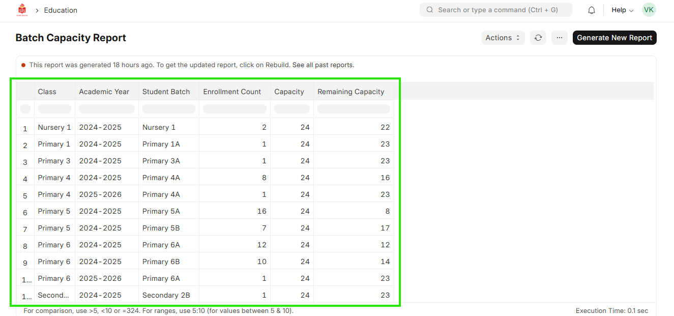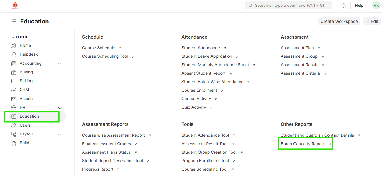 - Select Education module and click on Batch Capacity Report