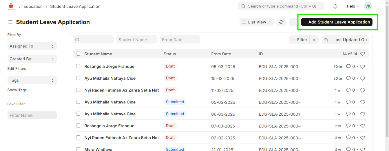 2. If the student was absent but needs to be marked as present, go to education module and select Student Leave Application