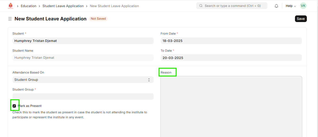 4. Update the reason and check on Mark as Present checkbox in the application window