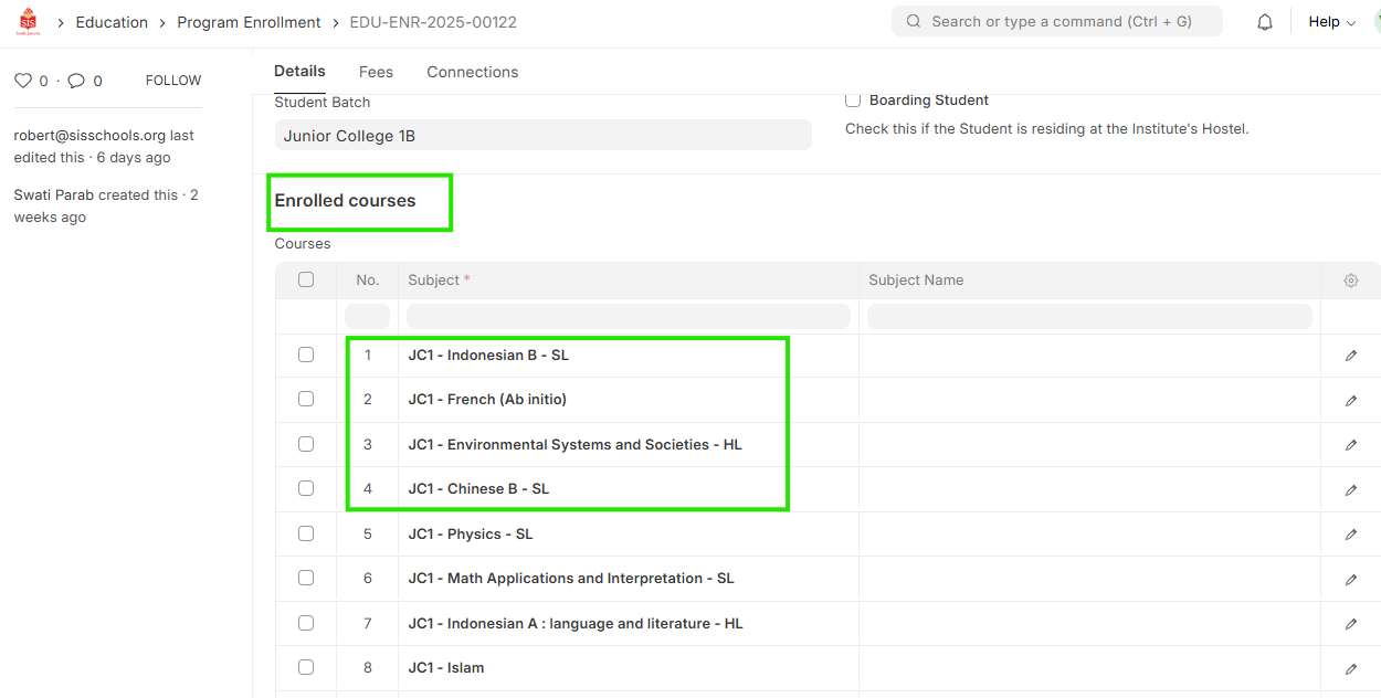 3. Check the enrolled course list and select the courses that are not applicable to the student from the subject list provided