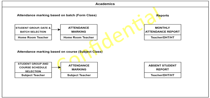 | Generating monthly attendance report for student | Teacher, DHT, HT | Education >Monthly Attendance Report | [Click here] |