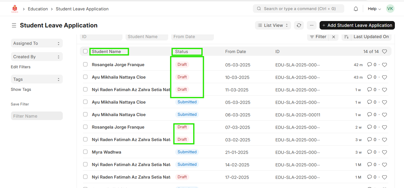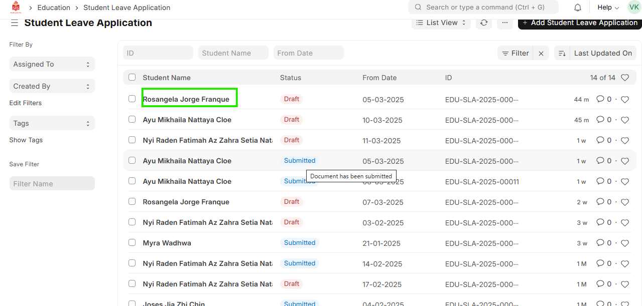 2. Check/Search the students that have applied for application of leave under the status of Draft
