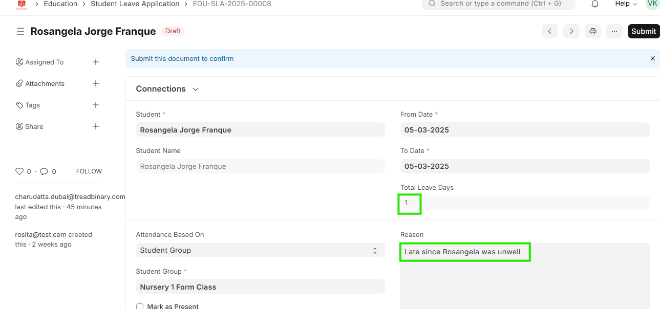 3. Check the details that have ben applied by the student. Check and confirm the schedule and the reason for absence