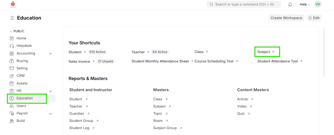 - Select Education module and select Subject/Course