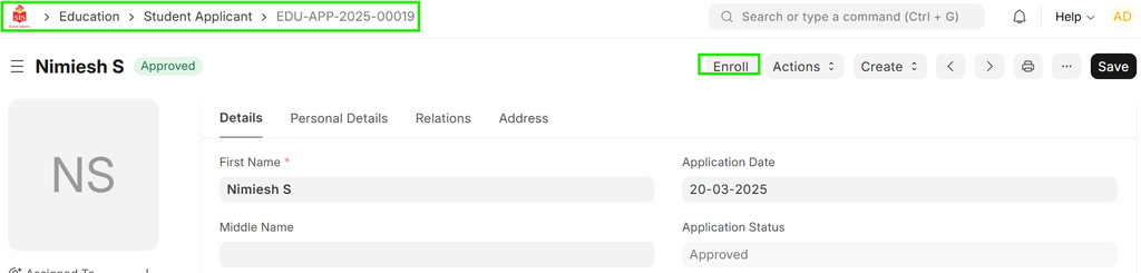 - Student Application Approved: Once the student application is approved, the "Enroll" button will appear.