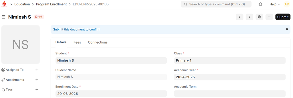 - Program Enrollment: The Program Enrollment form will be saved as a draft.