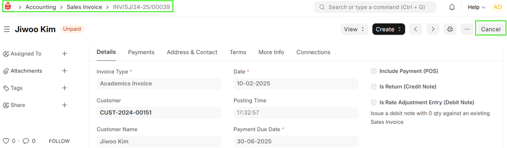 - Open the Sales Invoice to be cancelled.