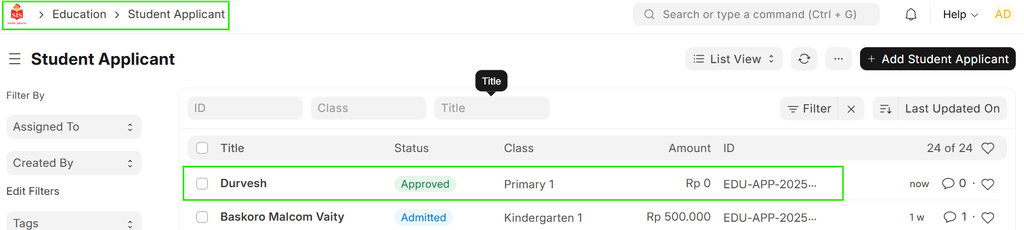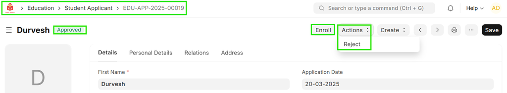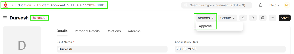 Home>Education>Student Applicant>click on Approve / Reject (button)