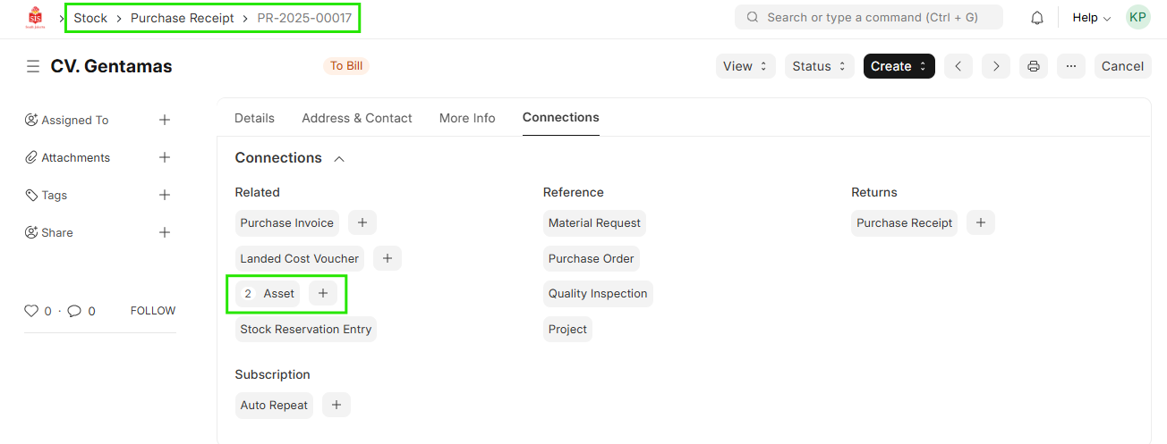 Stock > Goods Received Note > Connections > Asset