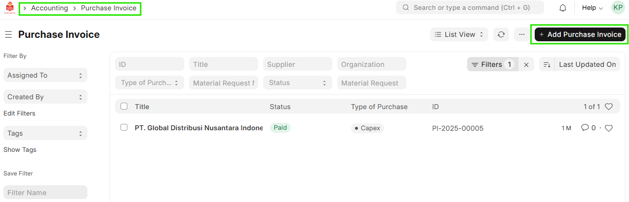 Navigation 2: Home > Select Buying Module > Select Goods Receive Note > Click on Create Button > Select Purchase Invoice Creation