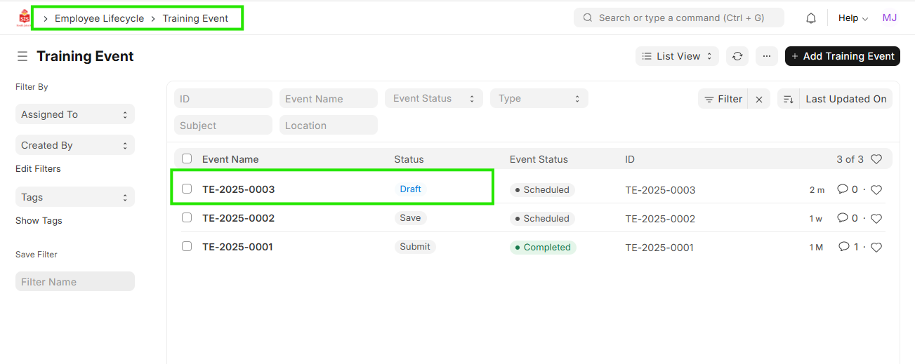 - Select the Training Event that needs to be submitted.