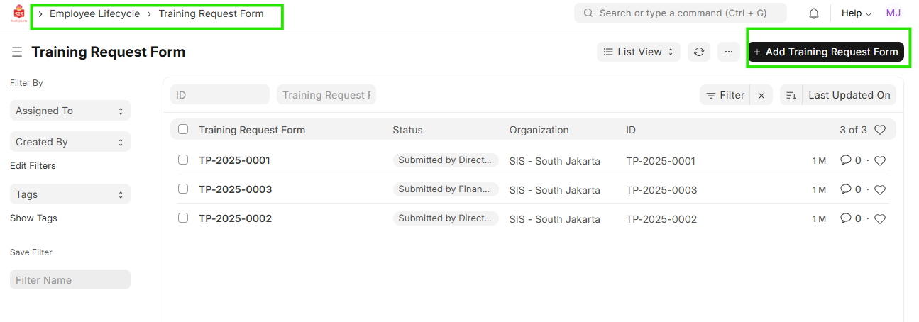 - Click on ""Add Training Request Form""